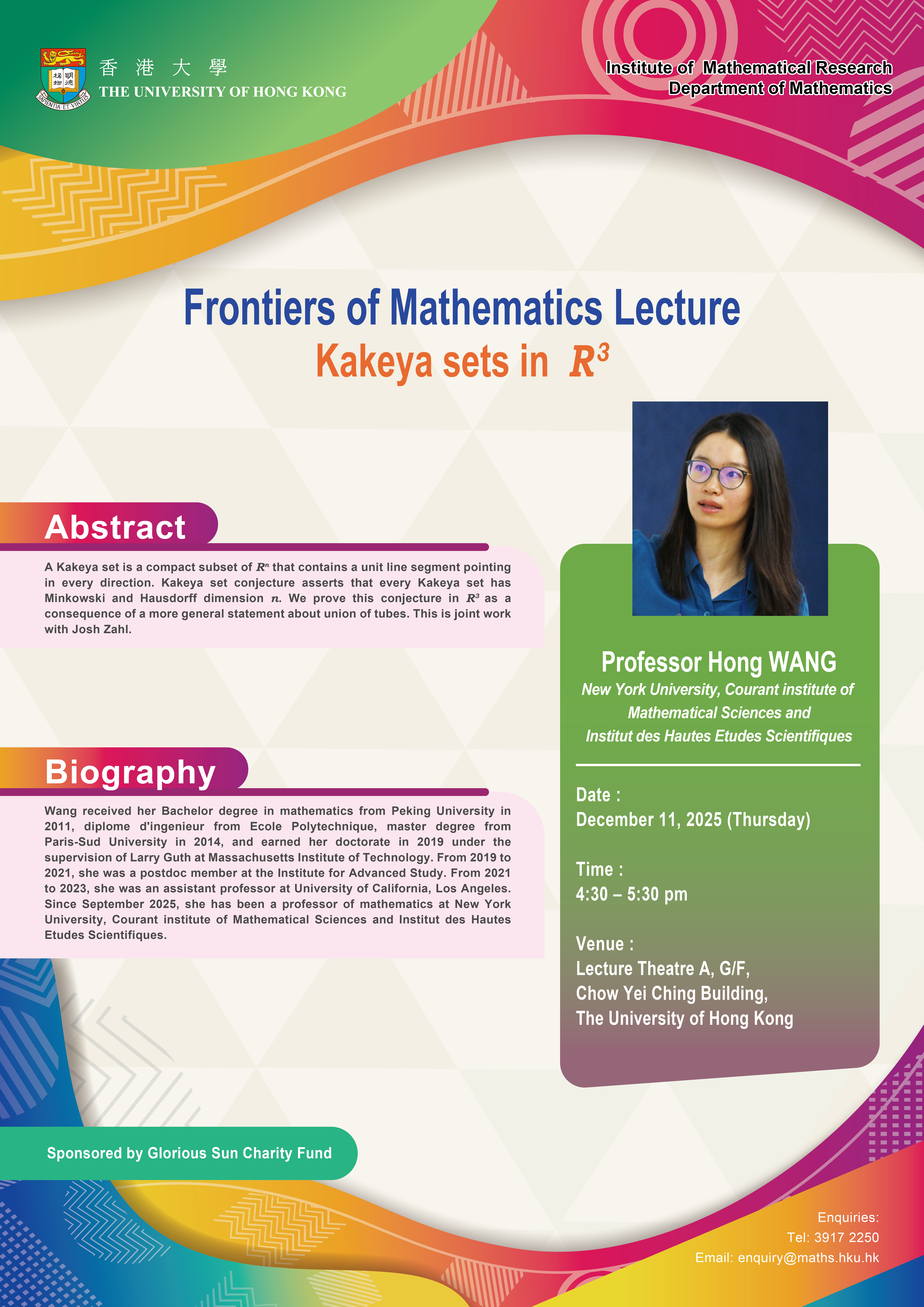 The Institute of Mathematical Research exemplifies the unique role HKU plays as a gateway for pioneering research, international scholarly exchange and world-class training. In Mathematics we link our region with the rest of the world.